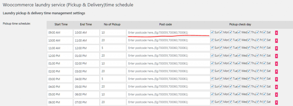 Laundry delivery/pickup time slot availability by zip codes in WooCommerce laundry plugin is as below-